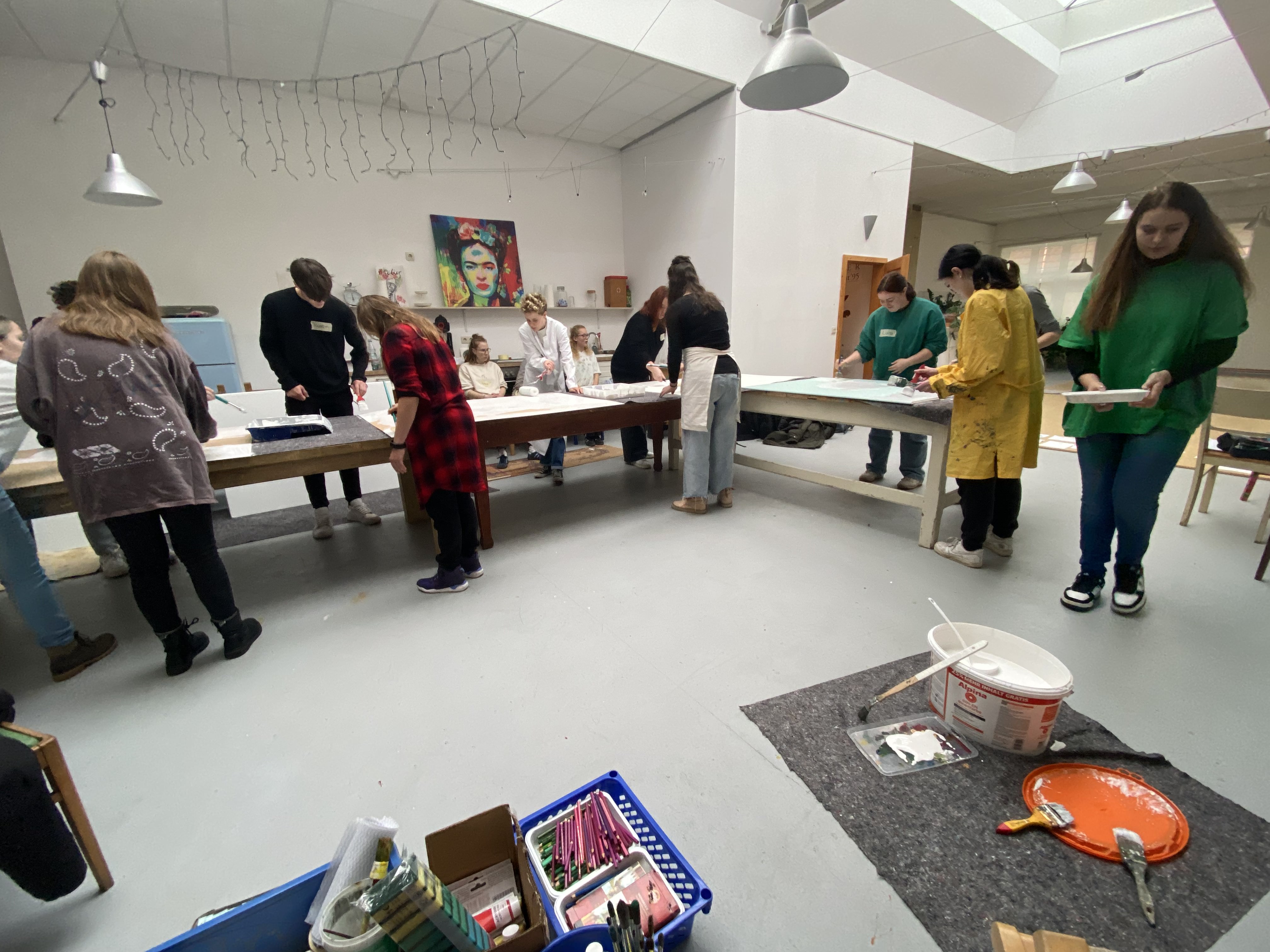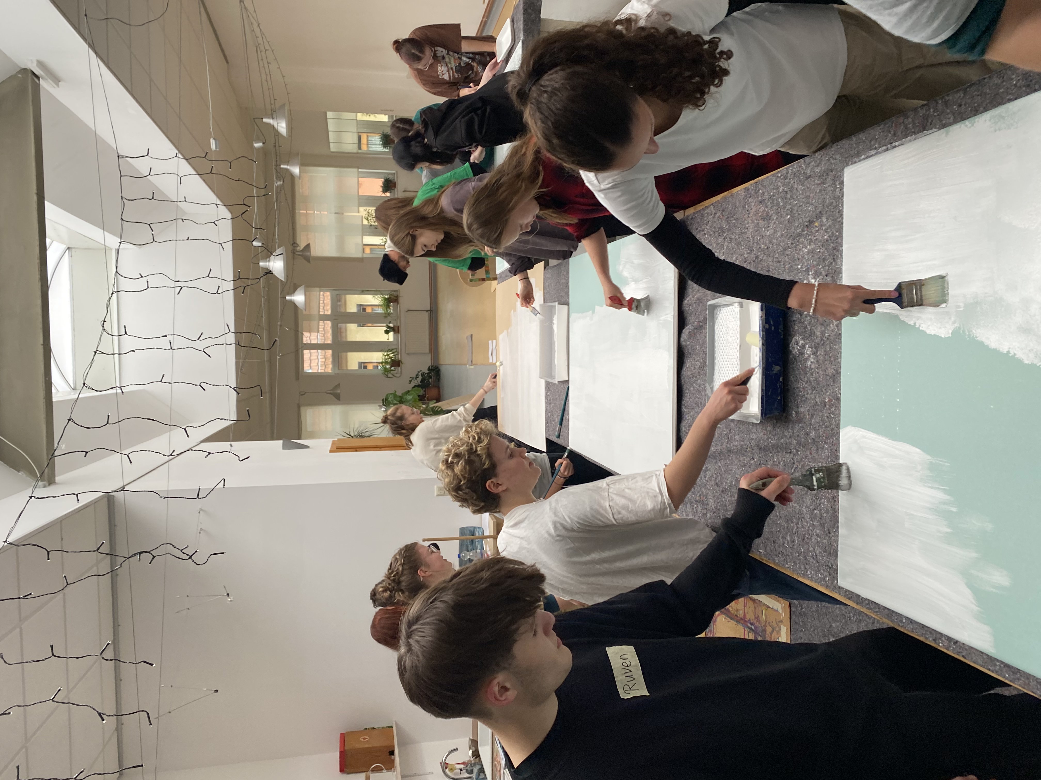 Unter dem Motto „Ich - Du - Wir“ starteten die knapp 20 Schülerinnen und einem Schüler am 17.11.2023 mit einer gegenseitigen Kennenlernrunde und zeichnerischen Aufwärmübungen in unser diesjähriges Kunstcamp, bevor die Aufgabe präsentiert wurde: Durchguckgemälde.