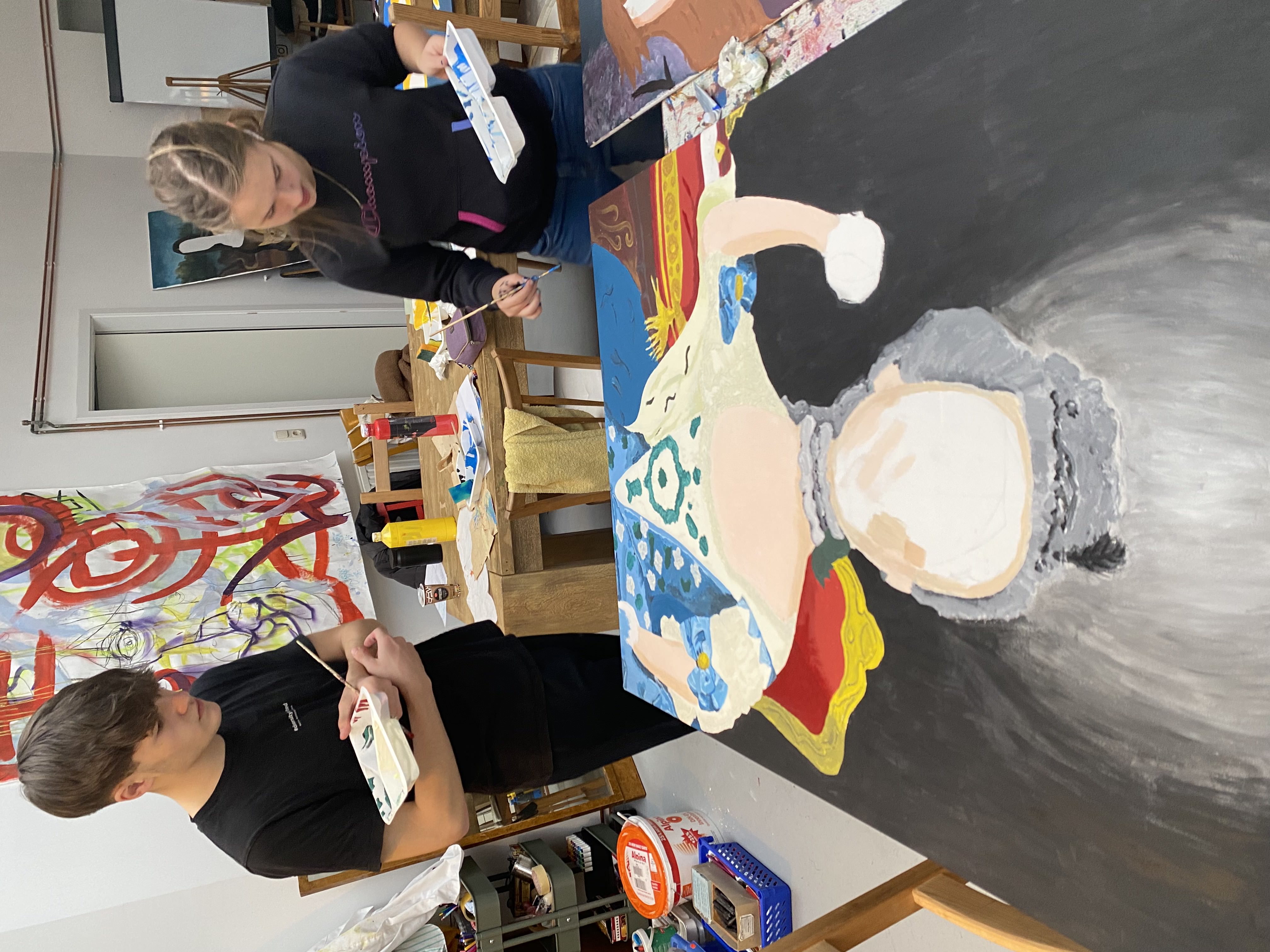 Quer durch die Kunstgeschichte bis hin zu topaktuellen Themen suchten sich zwei Partner ein Gemälde oder ein Bild einer berühmten Persönlichkeit bzw. Lieblingsfigur. Das Original wurde in eigener Weise neu interpretiert und bearbeitet. Dazu mussten die großen Unterlagen aus Gips oder Sperrholz grundiert und getrocknet werden. Die Nachwuchskünstlerinnen und Nachwuchskünstler übertrugen die eigens erstellten Skizzen auf das Großformat, mischten selbstständig Farben und gestalteten mutig, in höchster Konzentration und Ausdauer ihre Motive. Die Ergebnisse sind beeindruckend und werden sicherlich auch zu unserer Traditionsveranstaltung Talente.Machen.Geschichten. präsentiert, nachdem das eine oder andere Durchguckgemälde seinen Auftritt am Tag der offenen Tür haben wird. Kompliment an alle: Tolles Projekt und super Ergebnisse!