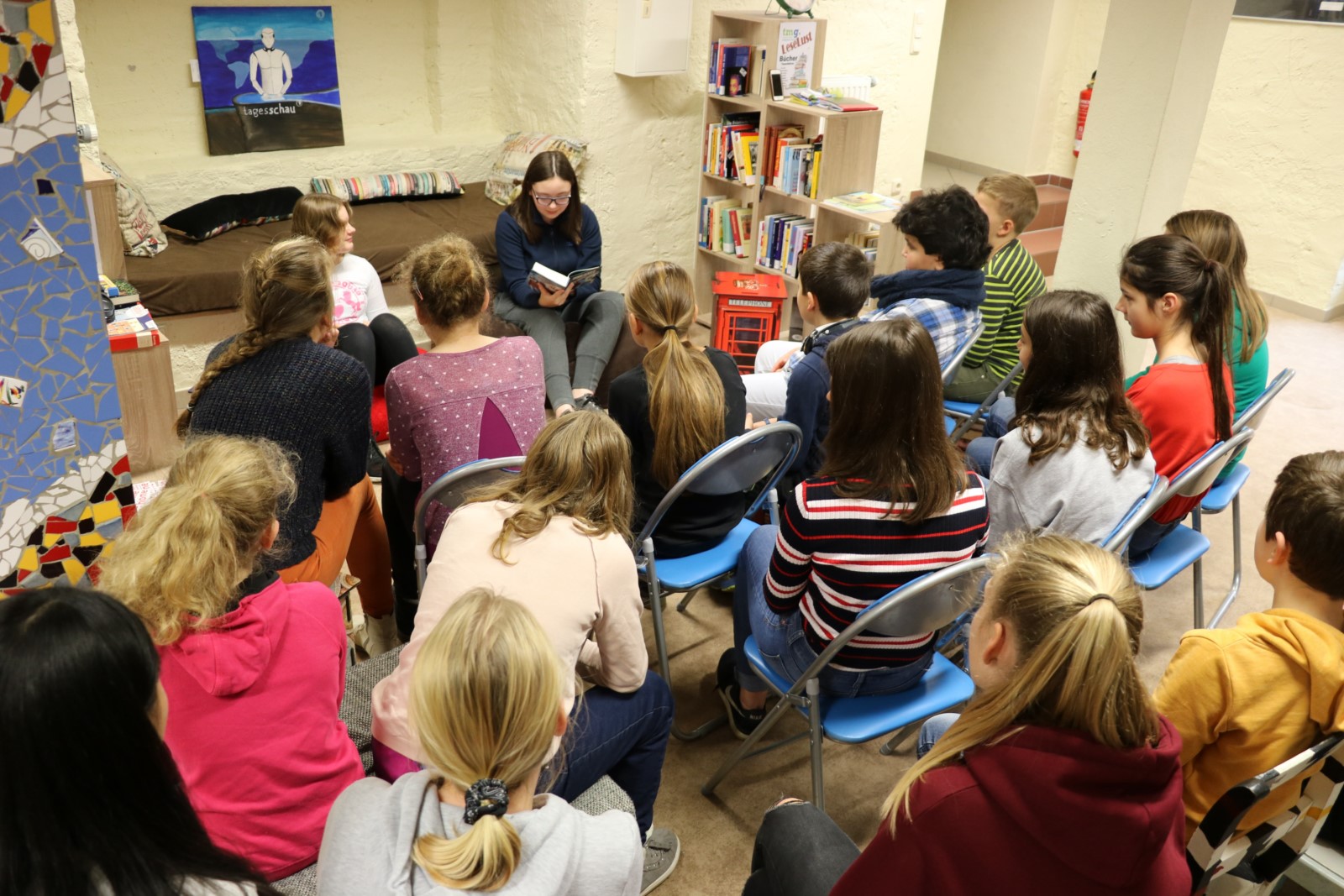 Sie treffen sich in dem 2015 an unserer Schule eröffneten Leseraum, der zu einem wichtigen Rückzugsort inmitten von Büchern für alle Schüler geworden ist. Es ist selbstverständlich, dass sich alle an die gemeinsam erarbeitete [Leseraumordnung] halten.