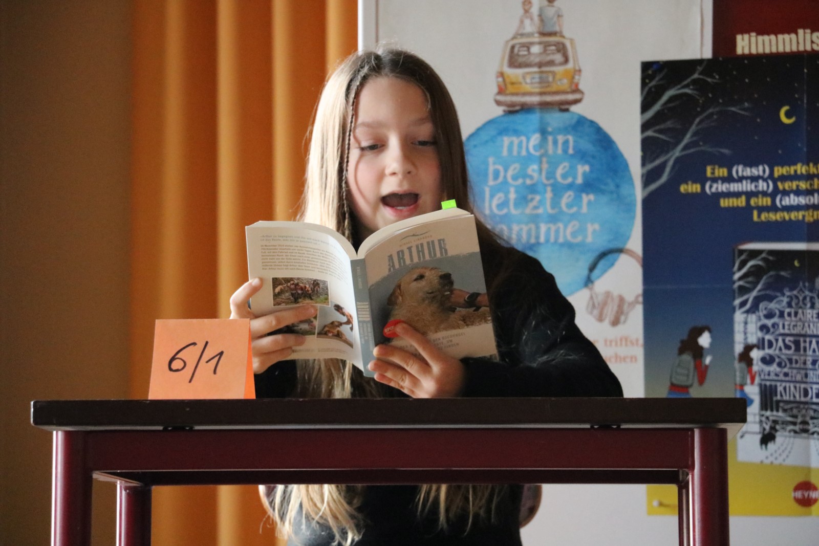 So wird jedes Jahr im November am Bundesweiten Vorlesetag traditionell der Schulsieger des Bundesweiten Vorlesewettbewerbs der 6. Klassen gekürt, der unsere Schule in der nächsten Runde vertritt. An diesem Tag werden zunächst alle Schüler der 5. und 6. Klassen eingeladen, in den im Gymnasium eingerichteten Leseecken den Vorlesern aus unserem Leseclub LeseLust zuzuhören, bevor dann der Wettbewerb der 6. Klassen vor Publikum und einer Fachjury in der Aula beginnt.