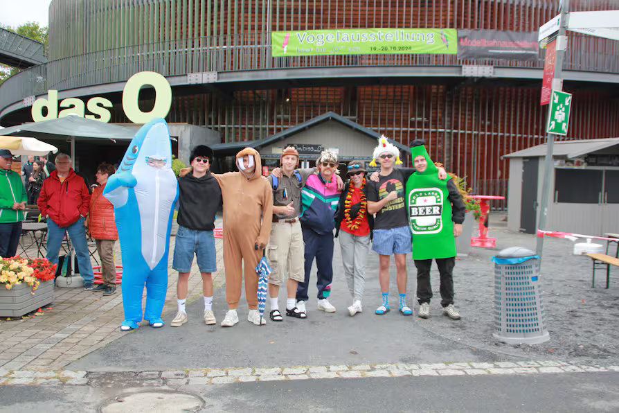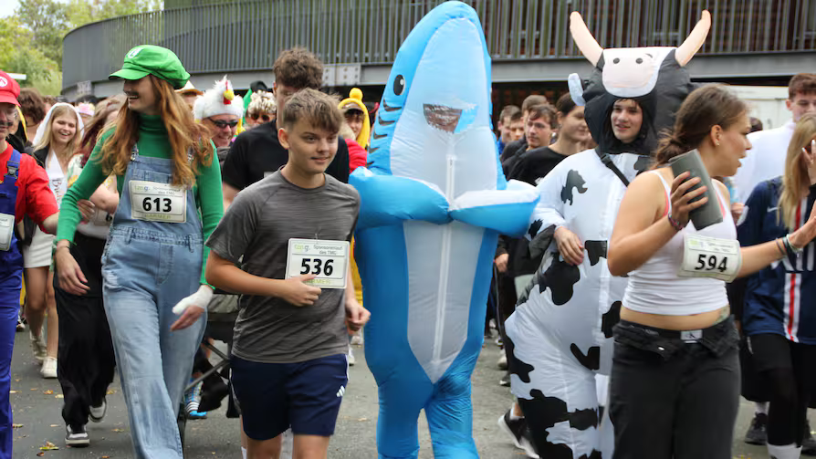 Beim Sponsorenlauf des Thomas-Mann-Gymnasiums waren am Donnerstag im O-Schatz-Park 620 Teilnehmer dabei – darunter auch Haie, Bierflaschen und Hühner. Das ist der Hintergrund für die verrückten Kostüme.