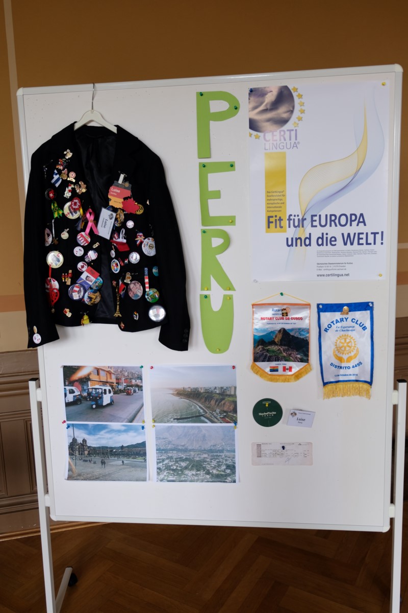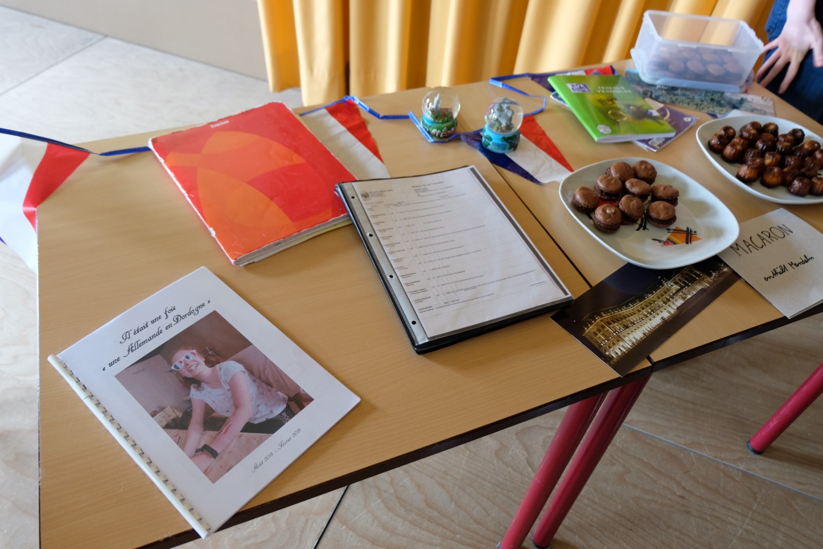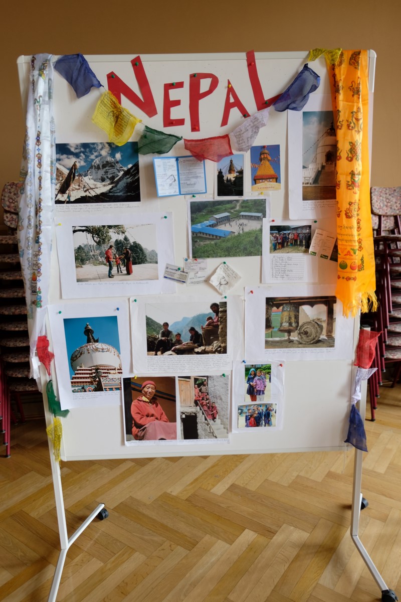 Ca. 90 Minuten teilten sie mit uns ihre Erfahrungen, angefangen beim Umgang mit körperlich beeinträchtigen Schülerinnen und Schülern in französischen Schulen über Wanderungen und beeindruckende Landschaften in Nepal bis hin zu traditionellen Getränken wie Chicha de Kiwicha aus Peru. Unterstützt wurden ihre Vorträge durch eine geschmückte Aula mit Präsentationstafeln sowie persönlichen Fotos und Andenken. Das i-Tüpfelchen: Die Besucher durften sich mit traditionellen Leckereien wie Macarons, Pie de Limon, Papadams und Masala Chai verköstigen lassen.