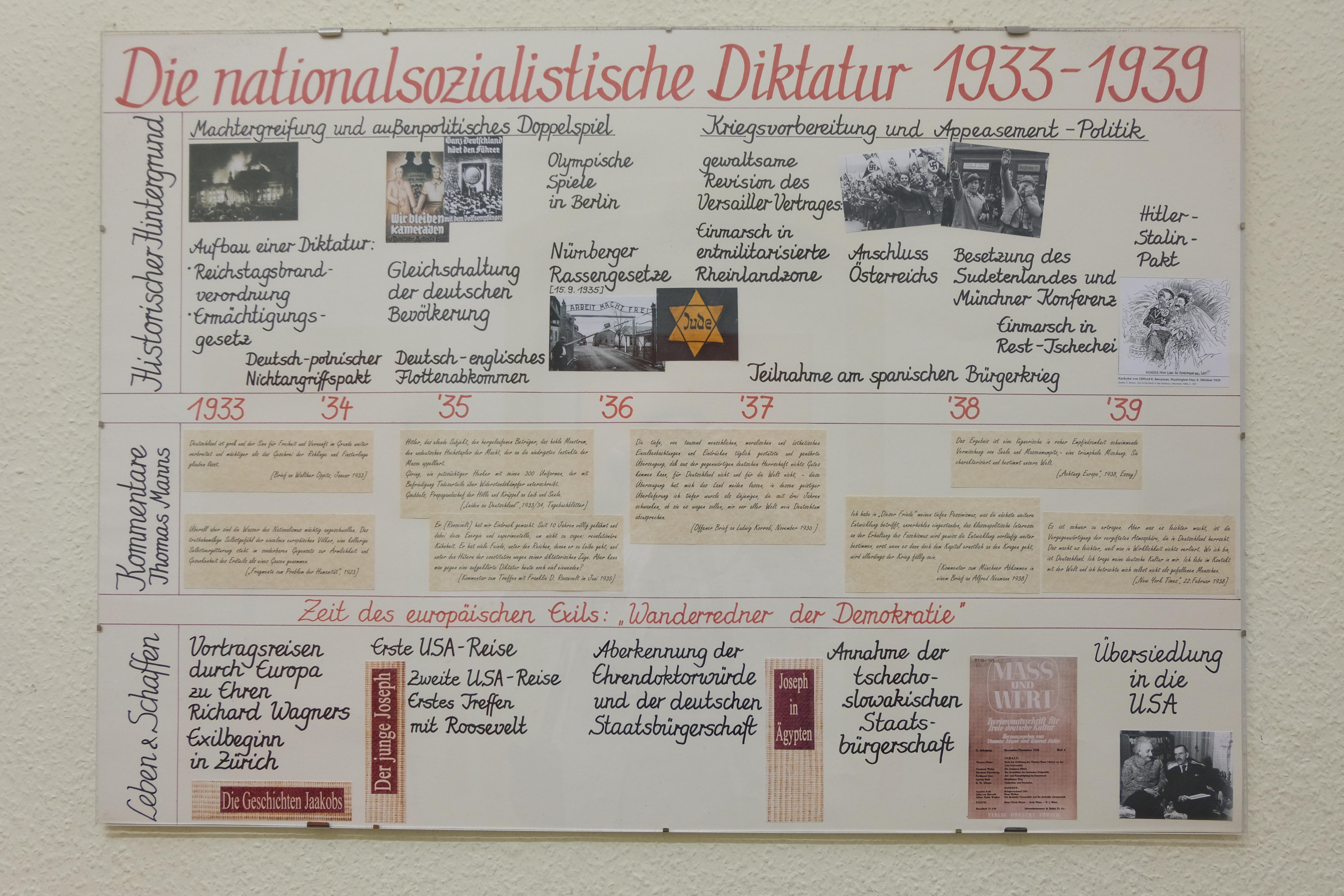Im Erdgeschoss des Hintergebäudes hängt dieser Zeitstrahl über den berühmten Namensgeber unserer Schule - Thomas Mann. Er ist in einem fächerverbindenden Schülerprojekt der Fächer Geschichte und Deutsch entstanden. Um die kleinen Kommentare auf den Abbildungen zu lesen, ist es nötig, die Fotos in Originalgröße herunterzuladen. Dazu einfach den Download-Button download picture logo des entsprechenden Bildes klicken.